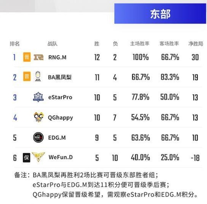 而东部现在说实话还没那么复杂了,2个确定打季后赛和1个确定打保级赛的队伍不论,QGhappy也打完了所有比赛,虽然目前第4,但后面的EDGM很可能追上来,前面的eStarPro除非连输2局才会掉到QGhappy后面。