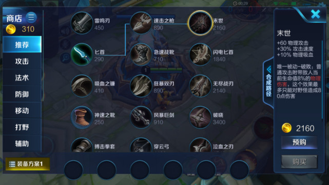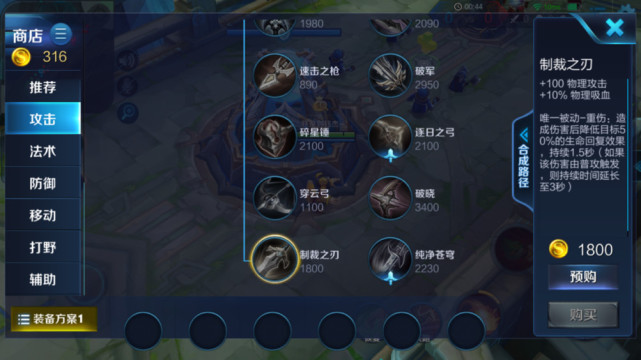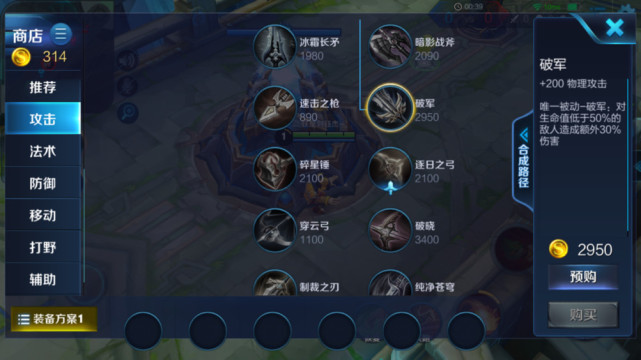 出核心装备没有错,但是核心装备一般都比较贵,应该放在比赛中期出,不能一开场就为了憋一个核心装备,其他装备都不出吧?像百里守约的核心装备是破军,售价是2950金币,虽然攻击力能增强不少,但是前期还不如出暗影战斧来得划算,既能增强物理攻击,还能增加生命力,对于血薄的脆皮英雄来说,能增加生命的装备都很重要。