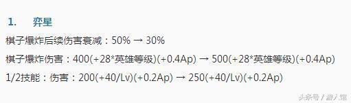 首先是弈星,这次弈星增强了很多,他1,2技能触发的那个棋子爆炸的后续伤害衰减变低了。同时这个爆炸伤害又变高了。再加上1,2技能的本身伤害也变高了。那弈星无论是消耗或者爆发都会强很多。再加上他的棋子伤害和大招是有连锁关系的,因此大招除了控制效果很强之外,伤害也有很大的提高。