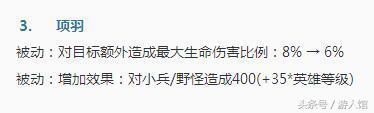 而项羽这个英雄,他的被动相当于重做了。其中对目标造成的伤害比例有所降低,可能会让他打团的时候稍微弱一点,但是增加了一个对小兵和野怪的额外效果。难道是要把他作为一个推线英雄吗?