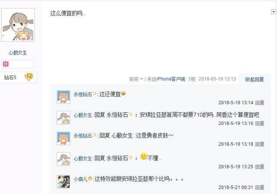 有土豪女玩家直接就说这个价格好便宜,后面玩家反馈这还便宜啊,后面土豪也说亚瑟和安琪拉也要710,这个不贵吧,后面玩家直接就说这是勇者皮肤,土豪就没回复了.