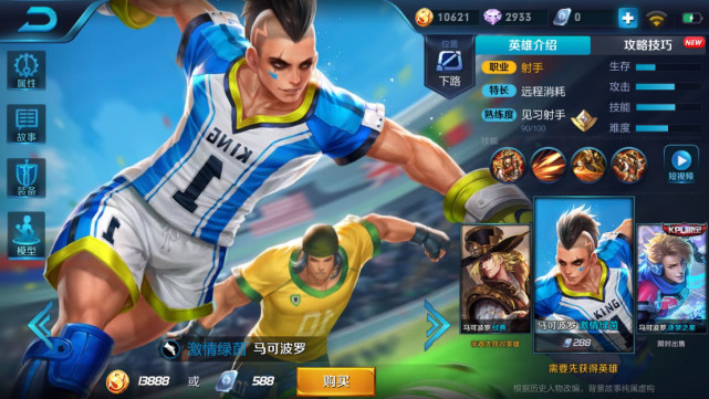 马可波罗作为远程消耗射手,专攻下路,三个普攻技能一个被动。第一技能:华丽左轮,该技能可将指定方向连续射击,可射击时会增加百分之十的移动速度,可有物理伤害加成。
