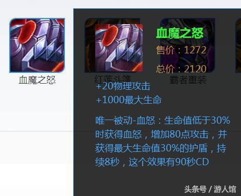 说了那些出场率比较高的,我们再来看看这个出场率最低的防御装,就是血魔之怒。这个装备加成的属性是生命和物理攻击。虽然有一个不错的被动,但是cd太长了,在连续的作战中常常触发不了,一般出它还不如出其他防御装备了。