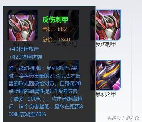 排名第二的则是反伤刺甲。这个装备在很久以前是非常强势的。好多英雄甚至要被反弹致死,不过后来经过几次调整,现在已经变成了中规中距。它提供的防御感很高,但是没有生命的加成,同时加的物理攻击会让一些战士的输出也提升一个台阶,特别适合那些冲锋到敌群当中的战士。现在非常火爆的典韦就是最适合他的英雄之一。