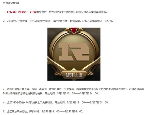 3、游戏内商城在售英雄、皮肤、改名卡、转大区服务、守卫皮肤、加成道具全场半价(3个月内新上架的道具除外)。并精选RNG在MSI出场英雄部分限定皮肤限时销售。开放时间:5月25日10:00——5月27日24:00。