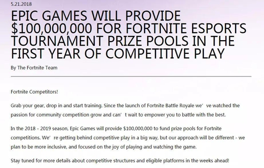 《堡垒之夜》开发商Epic今日宣布,将为即将到来的2018至2019年赛季的电竞比赛,