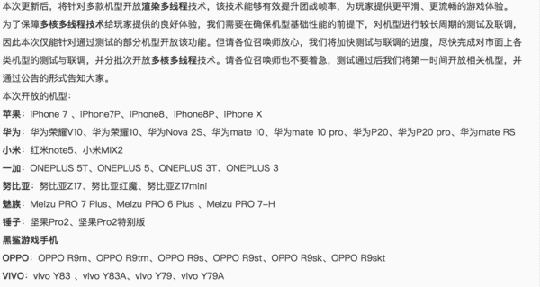 王者荣耀官方表示,为了保障多核多线程技术给玩家提供的良好体验,我们需要在确保机型基础性能的前提下,对机型进行较长周期的测试及联调,因此本次仅能针对通过测试的部分机型开放该功能。但请各位召唤师放心,我们将加快测试与联调的进度,尽快完成对市面上各类机型的测试与联调,并分批次开放多核多线程技术。