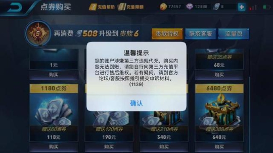 有位土豪玩家,想要买这款沉稳皮肤,所以就打算充点券购买。但是,当这位土豪充值6480点券的时候,天美却发出一个通知。这个意思就是,尽管充值了6480点券,但是依旧没办法到游戏账号上面。具体原因是这位玩家用了第三方代充,所以不能够到账。该玩家看到这个通知的时候,整个人都懵了,想购买天魔却不让。