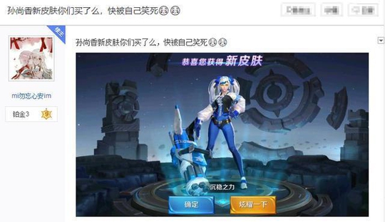 玩家买了皮肤之后不是第一时间去尝试游戏效果,而是炫耀一波,还问起各路网友都买了这款皮肤没有?感觉这款皮肤跟海报有点出入啊,但是价格确实很便宜.