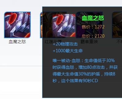 排名第六的则是血魔之怒,这个装备其实出的人也不多,在后期,很多时候是作为和复活甲的替换装来出的,因为它从某种程度上来说,也能增加一些血量。在复活甲cd或者已经失效之后就可以出它了。