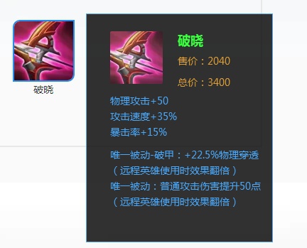 第八个是破晓。说实话,这个就有点让人想不到了,我本来觉得这个装备应该出得更早一些,想不到它在这个榜单上也上榜了,虽然价格很贵,但是我觉得合成还是蛮平滑的。而在后期这一个装备基本上就能当射手的两个装备了。射手现在之所以强势一些和它也是很有关系的。