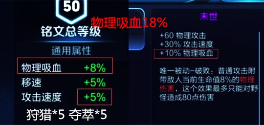 所以在有打野刀叠攻速的情况下,铭文我选择只带5%攻速,那么蓝色铭文5个狩猎就可以满足; 另外再带5个夺萃,弥补末世的略微吸血不足,毕竟实战中我们不可能出泣血。
