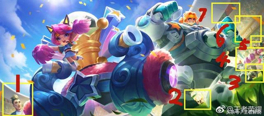 首先就是最明显的马可波罗了。作为另一款足球主题皮肤,马可波罗的激情绿茵能够出现在这张原画中应该是一点也不意外吧。不过这张图中王者解说还发现了另一个勉强算是彩蛋的存在,那就是激情绿茵后边的横幅,没错,又是腾讯游戏的英文字样呢。这两个彩蛋应该算是很常规的了,基本所有玩家应该都发现了吧。