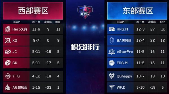 这届常规赛可谓出现了众多黑马战队,如BA黑凤梨,Hero久竞实力可见一斑,RNG.M更是获得了24小局连胜,11大局连胜的逆天战绩,老牌劲旅XQ,eStar也展现出了不一般的韧性。本届常规赛分为东西半区两组每组六支队伍,组内双循环每支队伍对战两次,组外单循环队伍间对战一次,然后每个赛区积分靠前的四支队伍晋级季后赛,其余两只去保级。从分组来看QGhappy所在的东部赛区可谓是异常的激烈,甚至西部第一的积分和东部勉强晋级的队伍积分一样,QG距离东部第一也仅仅相差两分,如果不考虑赛区,十二支队伍晋级八支,QG本赛季积10分排名是第六,所以可以看出,QG这次无缘季后赛运气确实不太好。