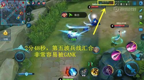 为什么要说这个,因为第二个红Buff一般会由打野来接手,而打野拿到红后的第一选择是什么?是不是发现第一次关注这个点?那么都知道第一个红Buff打完大概是40秒左右,第二个红Buff打完差不多在2分10秒——2分25秒左右,而接下来的这个时间段(2分48秒)刚好是上路第五波兵线的汇合时间!所以,这个时候一定一定要猥琐在塔内!如果第五波敌人没来,那说不定打野是再打鸟和四野,等到第六波兵线汇合时(3分21秒)又是一波大节奏。 总之,2分30秒——3分40秒这段时间内一定不要太上头。