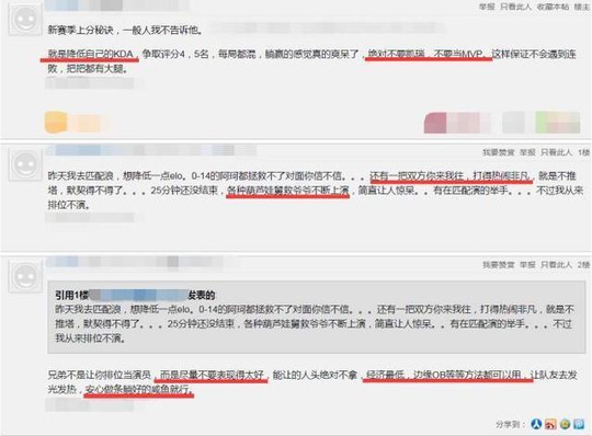 好比这位玩家他为了实验elo值降低之后的效果,就用自己的小号去打排位,连输了几局,结果匹配到的队友那叫一个坑,打的热闹非凡你来我往的,什么都打就是不推搭,非常的默契,游戏还未结束就出现各种演员,简直让人“目瞪口呆”,所以那个办法是否实用还得因人而异。