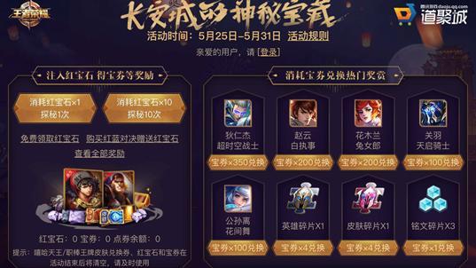 亲爱的召唤师们晚上好,今天小编要跟大家分析一个福利活动!5月25日王者荣耀官方推出了一个名为“长安城的神秘宝藏”活动,在活动中各位玩家都有机会获得:嘻哈天王/职棒王皮肤兑换券,击杀/回城特效,改名卡,夺宝券等多个奖品,看起来是不是非常令人心动!