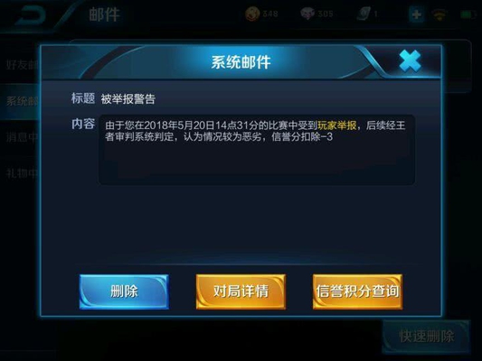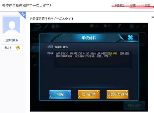 在玩家推出游戏之后,突然看到邮件里有新邮件,就打开来看一下,结果邮件写的是,比赛中受到玩家举报,经系统判定,认为情况很恶劣,信誉分扣除3分,这是玩家心情就不能谈定了还很气愤,当时估计把系统的全家都问候了一轮了,自己打出最后的成绩,队友没有扣分,反而自己要扣分,难道现在比赛打得数据好也要扣分,那高手是不是就不用活了?