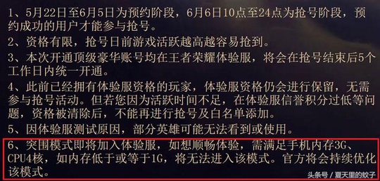 这是王者荣耀体验服要求的配置,想要流畅体验新模式就需要达到王者荣耀要求的配置,低于这个配置将无法进入该模式。各位小伙伴们,看完了王者荣耀体验服需要的配置后,你的手机还带的动吗?