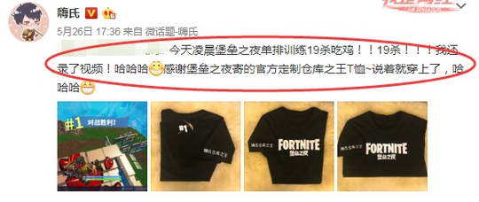 这要从嗨氏最近更新的一条微博说起。话说在5月26日当天,嗨氏发了这样一条微博“今天凌晨堡垒之夜单排训练19杀吃鸡!!19杀!!!我还录了视频!”如图: