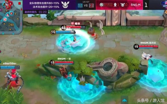 第二局eStarPro使用了大乔的电梯流战术,在前中期的团战中有一定的优势,常常都把RNGM打得到处跑,但是RNGM的运营无疑更好,在牵制中不断推塔,很快就拔掉了eStarPro的所有外塔,并且关羽的存在常常让eStarPro不能安稳的在大乔的二技能里面回城也成为一个隐患。最后一波,RNGM把兵线都运营到eStarPro高地。关羽再次横冲直撞,eStarPro无力防守。RNGM拿下这一局,双方1比1战平。