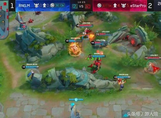 第一局,RNGM靠着东皇太的一强势拿下一血,又疯狂压制下路,但是eStarPro靠着嬴政的消耗能力顽强的防守住了,并且连续拿了好几个暴君,经济反而领先,之后在上路打了一波0换3,掌握了节奏。之后eStarPro拿下主宰,强攻高地,虽然被RNGM反打了一波,但是eStarPro还是有一定的优势,最后一波,eStarPro的双边把RNGM的阵型冲得很散,成功打出0换4,一举拿下比赛,1:0领先。
