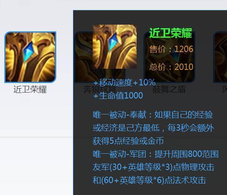 近卫荣耀的价钱是在辅助装备中相对较贵的。而它和其他辅助装备不同的就是这个被动效果了,这个被动效果总是会无形中影响我们的团战。有了它之后,相当于每个英雄都多了一个800元左右的小件,这性价比一下子就出来了。