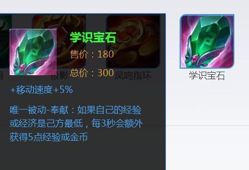 最后我再说说辅助装备最开始的这个学识宝石吧。可以看到这个装备的总价是300,售价是180,差距120。而如果自己金币是全队最低的话。3秒钟会获得5金币。一分钟就相当于100,意思就是只需要一分钟多一点就可以回本了,并且还白送了5%的移动速度和经验加成,因此如果自己被压,经济成为了最差的,那么购买它绝对是大赚的。