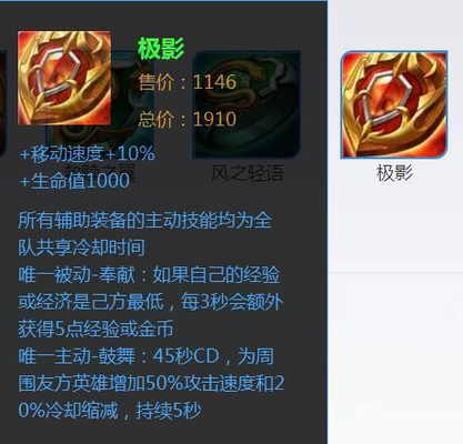 极影这个装备也是同样的问题。主动效果是不错,但是就是沟通的问题。你用了之后可能就只有你自己知道用过了这个装备,而其他队友很可能直接就把这五秒时间给浪费了。所以说它的购买率和胜率都不是很高,在目前的环境下,不太推荐大家来购买。
