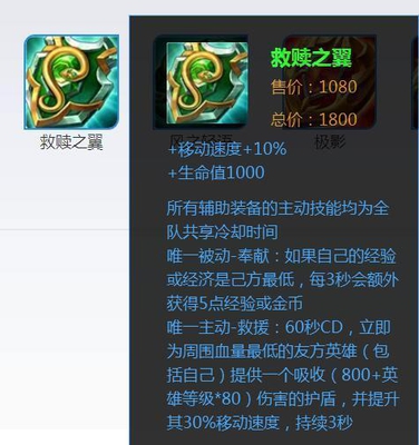购买率和胜率第二高的就是救赎之翼。这个装备虽然是一个主动效果,但是只要善于利用的话,在很多时候都可以救自己或者队友一命,甚至有时候还有反杀的可能,从而改变一场团战的走势。建议一些保护型辅助可以优先出这个。