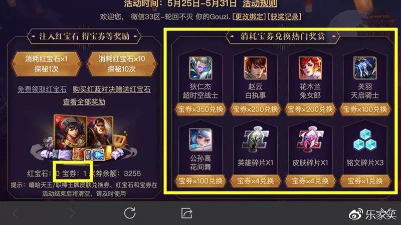 另外,每一次抽奖都会额外赠送一张“宝券”,收集宝券可以兑换右边的奖励。(如果按RMB算,每张宝券是2块钱,也就是狄仁杰皮肤要700块才能换,所以右边的奖励也相当于可以无视了)