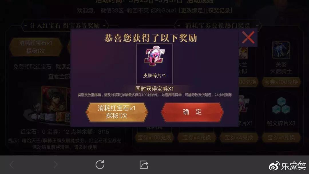 登陆免费送的红宝石只拿到了一个皮肤碎片,虽然没有中大奖,不过也总聊胜于无嘛。