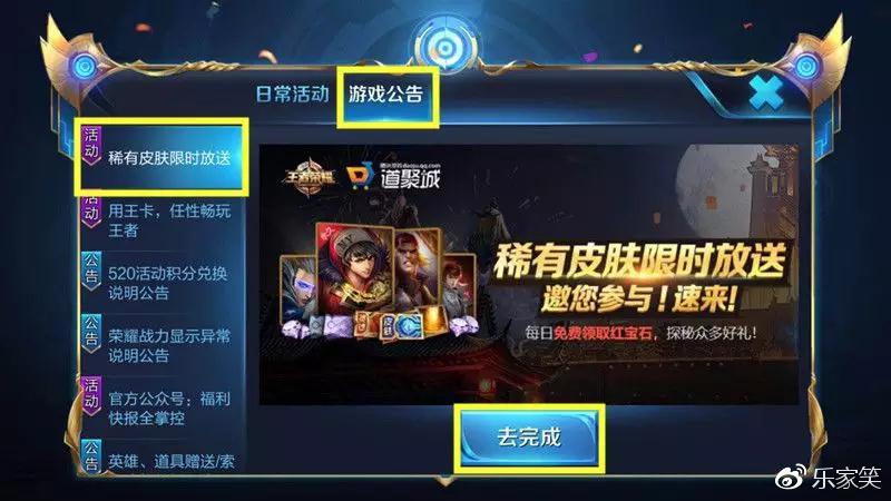 这次活动被隐藏的非常深,登陆游戏时不会像以往的活动那样弹出来让你参加,也不会有提醒点击的红点点。所以需要我们手动打开活动界面,步骤为:活动→游戏公告→稀有皮肤限时放送→去完成。