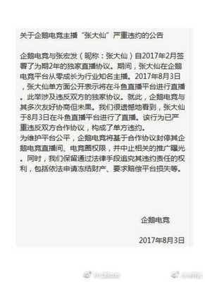 在张大仙跳槽来到斗鱼TV后,企鹅电竞发布“张大仙严重违约公告”并将追究责任,而张大仙前女友灰灰就曾经爆料过张大仙违约跳槽的合同问题,当时企鹅电竞申诉的是要求张大仙限期不得直播,并且还需要赔付违约金。