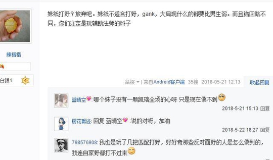 妹纸打野?放弃吧。妹纸不适合打野,gank,大局观什么的都要比男生弱。而且脑回路不同,你们注定是玩辅助法师的料子