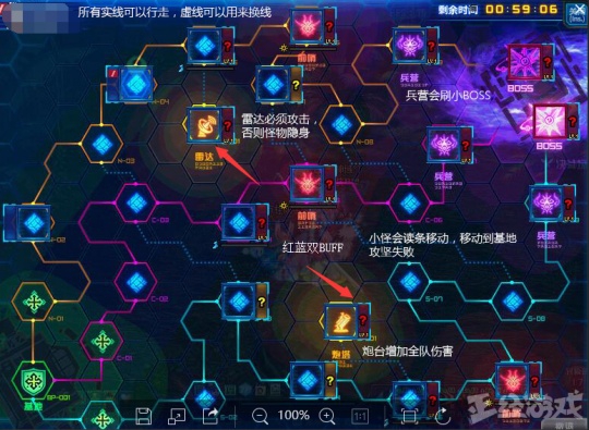 总结一下,三条线所以必须得三个队伍,建议分组是三三二,两个队伍上下两路破雷达,中路强力大C直取BOSS首级。