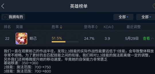 而妲己在增强后,胜率也有了突飞猛进的提高,直接到了51.5%。关键还是23技能的施法范围增加,让她能从很远的地方就先手到对方,同时自身的安全也有了很大的保证。只要能拖到后期,没有几个英雄是她的对手。