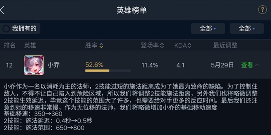 小乔这个英雄,这次胜率提高得就更快了,移速和二技能范围的加强。让她无论是打先手,或者是消耗都比以前要强很多。很多时候还没近她身,就要被打掉大半的血,加上大招机制在以前修改过一次。在后期伤害足够的时候,爆发能力绝对是比以前要强的