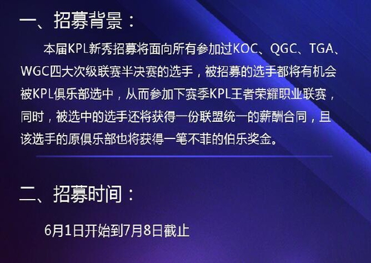 可以看到想要参加这个选秀大会还是有一定条件的,必须是参加过KOC,OGC,TGA,WGC半决赛的选手,这四个比赛都是通向KPL职业联赛的桥梁。但是由于现在KPL预选赛的竞争越来越激烈。所以说就算在这些比赛上获得了冠军,也不一定肯定能进入KPL职业联赛,现在相当于里面的选手又多了一条出路。