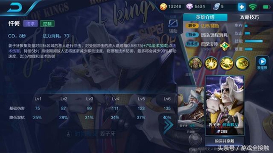 第一位——姜子牙:可能由于大家经常见他打中单位,就忽略了他真正的辅助定位,其实姜子牙之所以能打中单是因为他本身的技能特性,他不需要常规辅助的游走、支援,就能给队友带来收益,那就是经验加成,所以说有他在的一方往往都是等级有优势的,这点是比经济优势还要重要的。而他的伤害一样不容忽视,1技能的减双抗、2技能的强制位移,大招的超远蓄力伤害,每一个都有着不俗的伤害能力,一刀甚至adc半血被他的1技能给毒死了,也是气的不行。