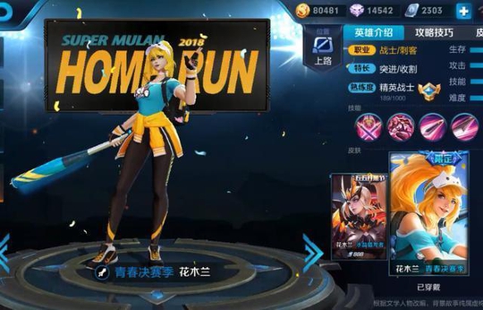 首先来几张出场画面的截图,下图就是王者荣耀海外版的花木兰棒球皮肤了,小伙伴觉得这款和青春决赛季对比如何呢。