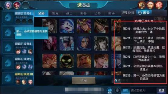 不过这种情况也比较少见,大部分玩家还是很“和蔼”的,甚至有些小伙伴还自带幽默细胞,最近有位玩家在排巅峰赛的时候就偶遇了一位学霸队友,为什么说他是“学霸”,看看他发的消息就知道,在开局的BP阶段,这位“学霸”为了阵容上的合理和战术的运用,开启了话痨模式。上来就连发6条消息,什么“纵横之术,为上下中边路英雄合为一体,我们抓上下猥琐,抓下上猥琐,中随”是不是很有深意,小伙伴是不是学到点儿什么,这位“学霸”队友不仅将历史学学的很好,连政治都能够融会贯通,虽然知道这都是搞怪的东西,但是不得不说这位“学霸”还是很有才的。