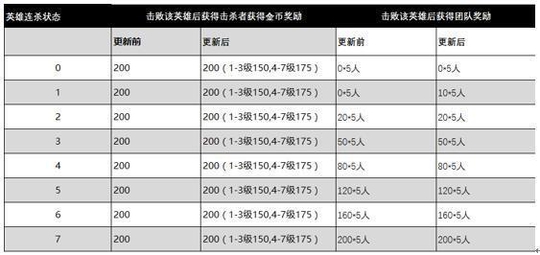 击败英雄奖励的金币也将调整,一血只有275金币,击杀等级越低的英雄,奖励的金币将越少,1~3级150金币,4~7级175金币,之后全是200金币,而自然增长的金币提升至3金币每秒。其次,击败连杀英雄的金币奖励也有调整,只不过只调整1连杀的奖励,团战奖励由0提升至10*5人。