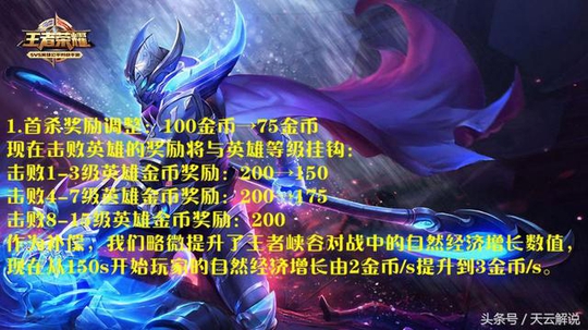 从上图可以看出,这一次拿一血的金币奖励减少了25g,并且以后所击杀的地方的金钱将与等级挂钩了,只有8级以上才有200g,看来以后线上的经济是一点都不能落下了,而为了补偿玩家,官方有调整了一下自然增长的数值从150秒开支增加到3金币/秒,峡谷的节奏将会越来越快!