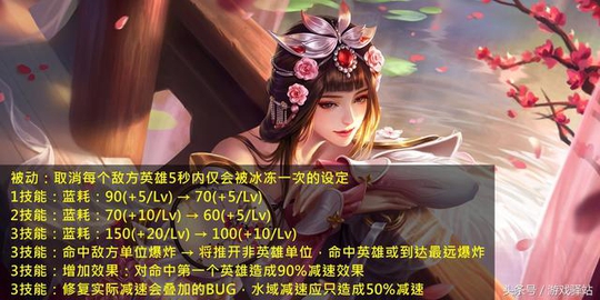 甄姬这次调整称得上史诗级加强,不仅取消了敌方英雄5秒冰冻一次的设定,还下调了全技能蓝耗,另外大招更改为命中英雄后爆炸,同时增加对第一个敌人造成90%的减速效果,如此调整意味着触碰到小兵不再提前爆炸,大大提升了甄姬的控制留人能力!