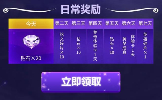 期间可以领取:钻石*10(20),铭文碎片*10,梦奇体验卡,以及英雄碎片*