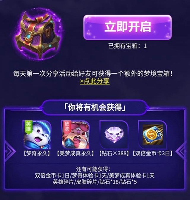 这部分活动内容对小编诱惑还是挺大的(没皮肤烦恼)。因为要求很简单,每天完成一局游戏就可以领取到宝箱,而且,玩家们只需要每天分享活动给好友,又可以额外领取宝箱一个,毕竟,多一个宝箱,也就多了中奖概率!没错,即使冲着梦奇白日做梦皮肤去的!