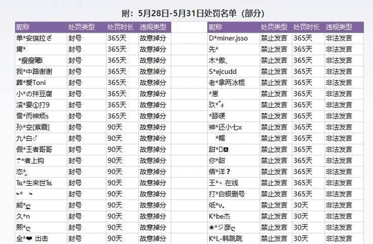 以下是王者荣耀官方惩罚部分玩家的名单,不管是故意掉分、辱骂等影响游戏体验的行为,最高进行封号365的惩罚。