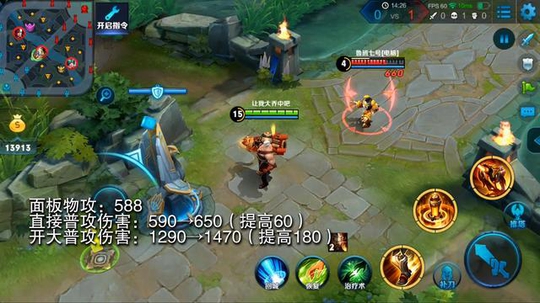 我们面对小鲁班测试一下。我们的面板物攻是588,直接普攻伤害是590,开大之后的普攻伤害是1290,大家可以记住这几个数字,我们买到速击之枪可以再看一遍。速击之枪提高普攻伤害30点,远程英雄翻倍,黄忠显然是可以翻倍的,那么他是提高60点普攻伤害。我们现在直接普攻伤害是650,然后开大之后的普攻伤害是1470,可以看到直接普攻伤害的确是提高了60点,但是开大普攻却提高了3倍——180的伤害。