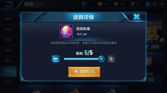 如果发现这个竞技彩蛋不够,也不用慌张,赶紧打开商城,在特惠中,可以使用钻石兑换五个竞技彩蛋,单个彩蛋需要60钻石,有点小贵。